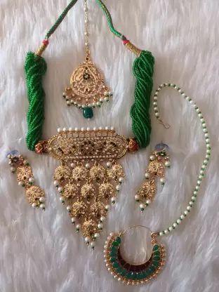 beautifull jewllery set with earrings and tikka nosepin in green colour