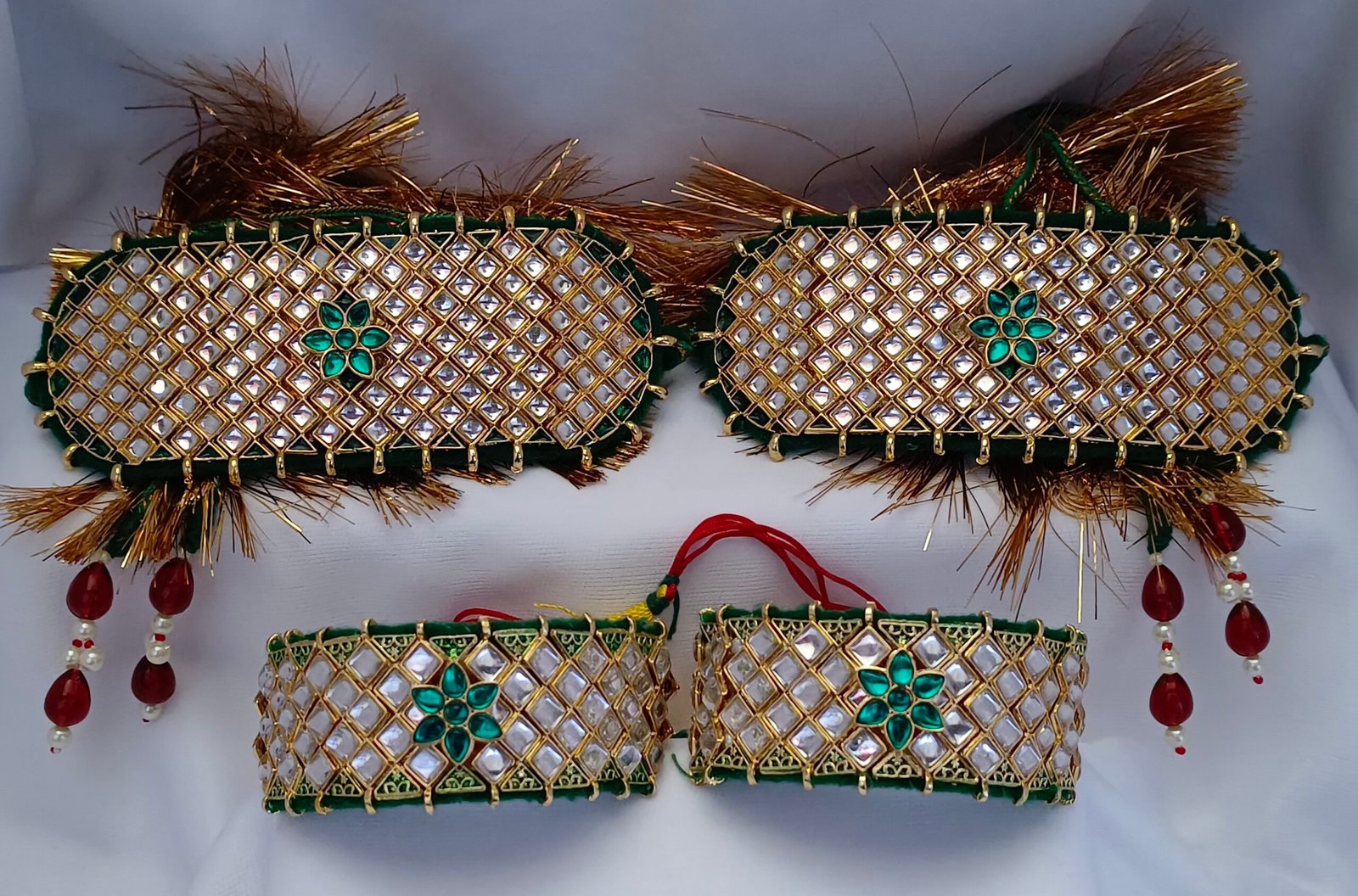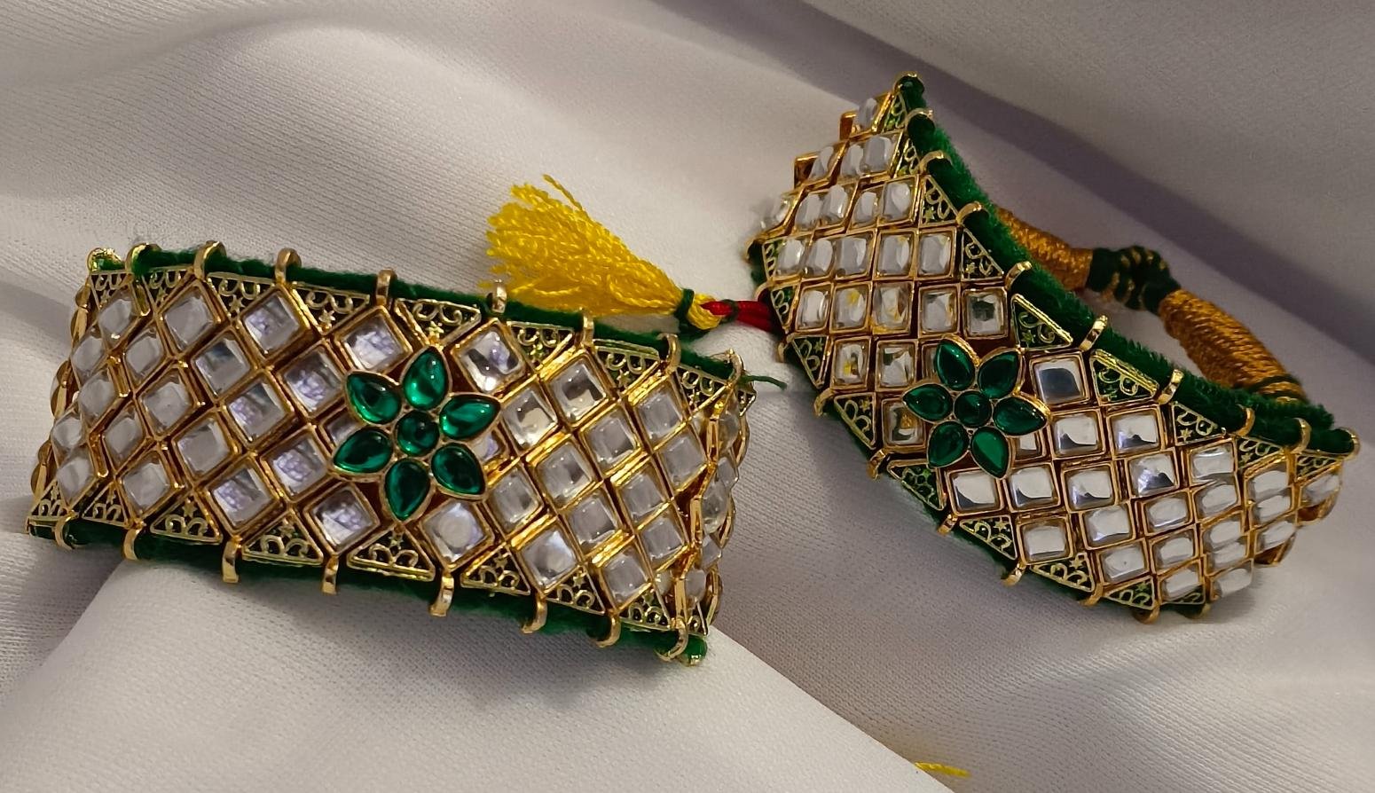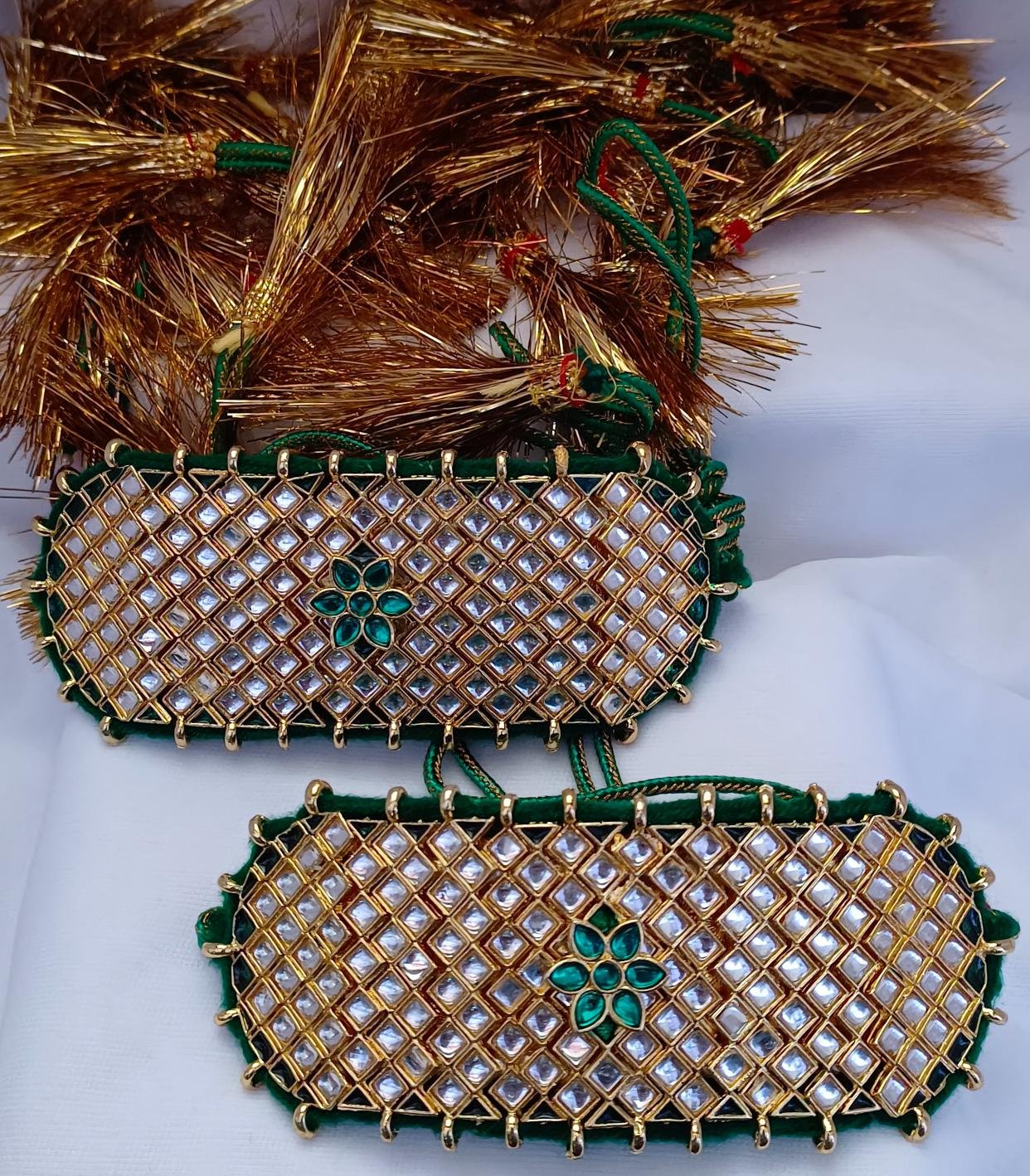 - Versatile Wearability: The Kundan Green Bajuband Pochi Combo Set can be styled with a variety of outfits, from ethnic wear to contemporary ensembles, making it a versatile accessory for different occasions.