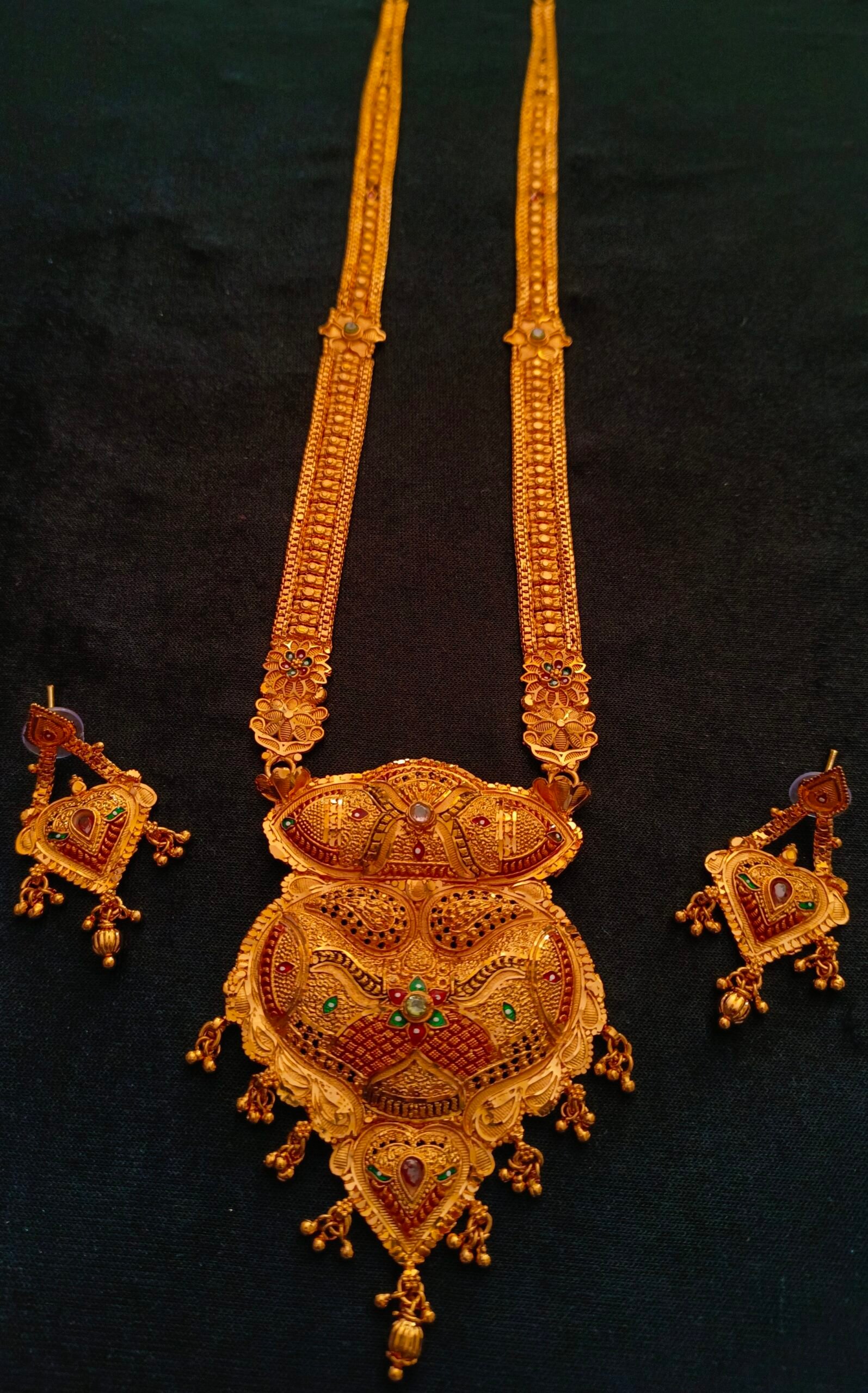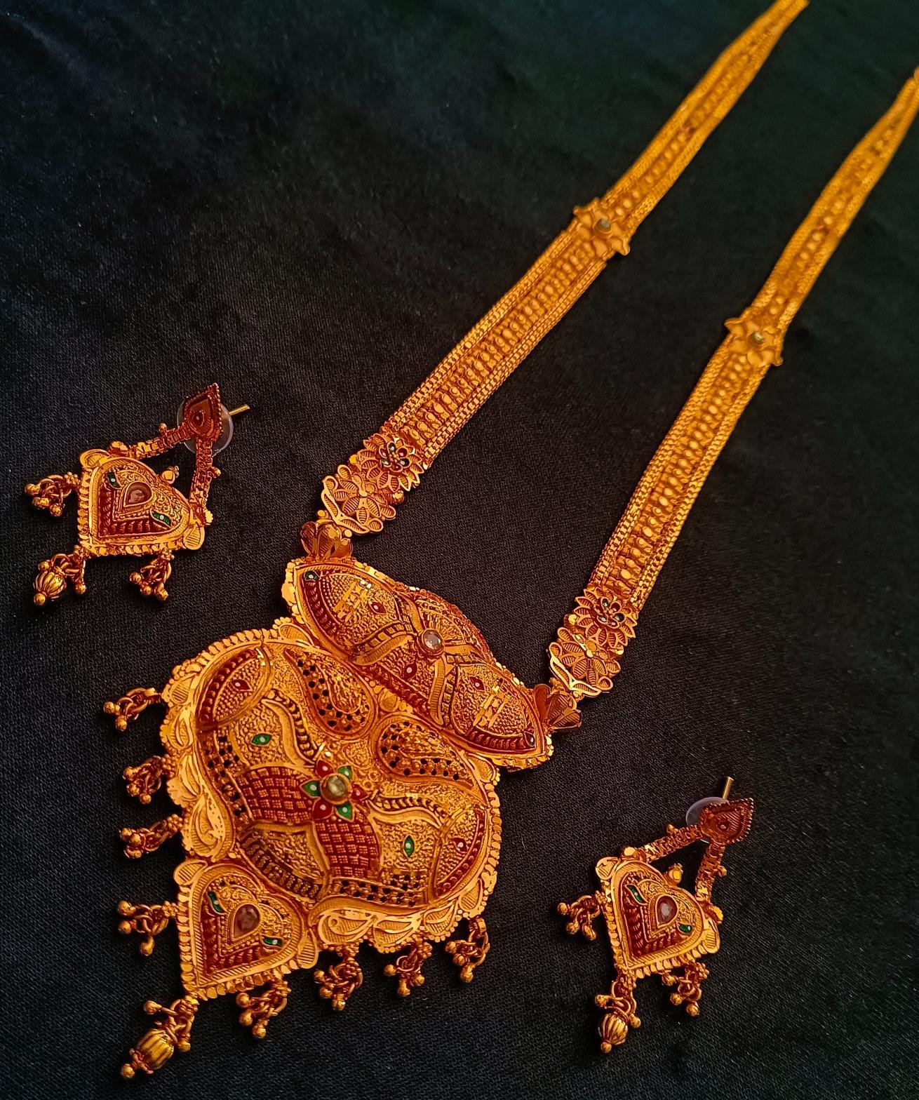 Key Features of the One Gram Gold Polish Plated Copper Rani Haar with Earrings